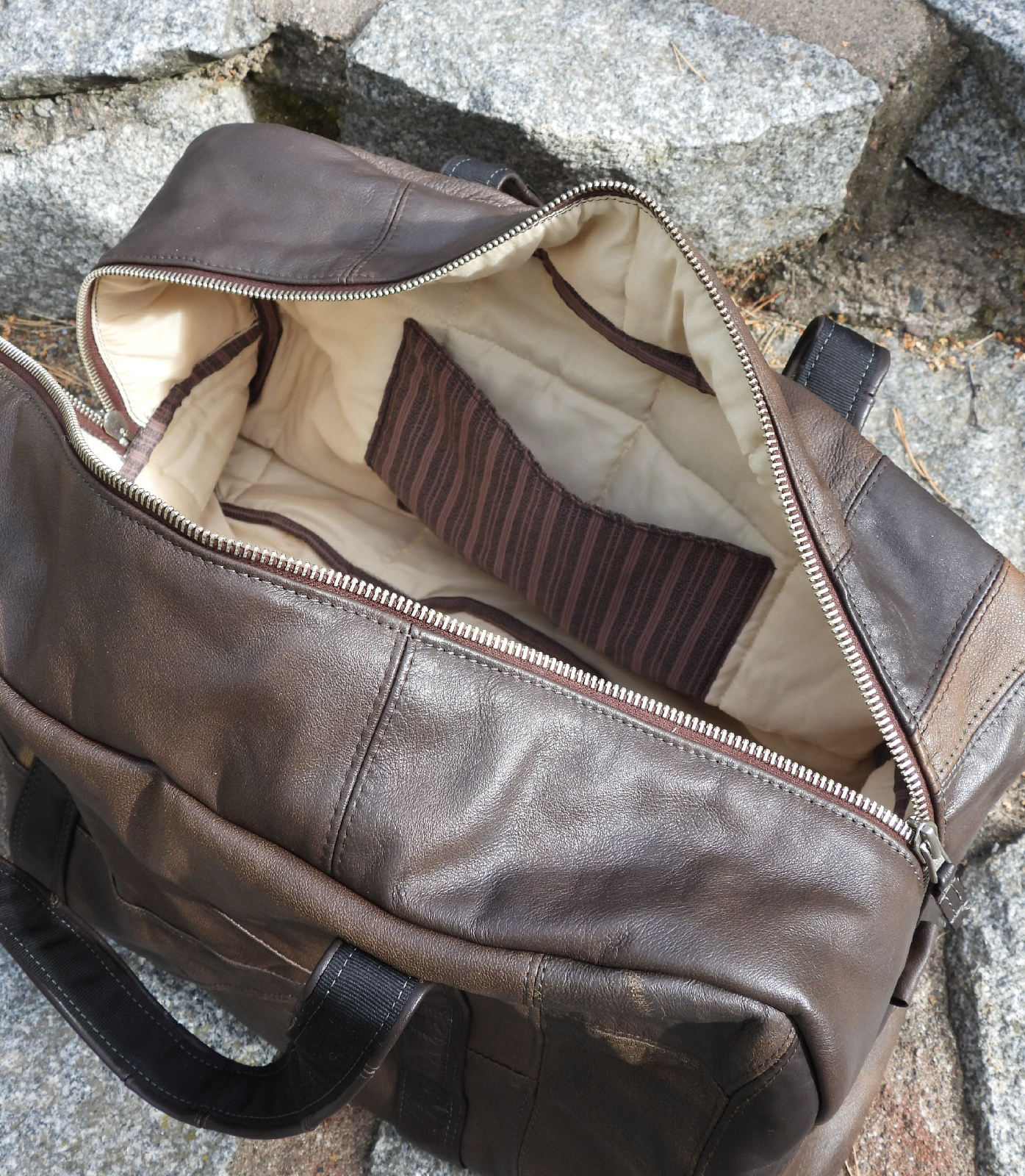 Vaatehuoneen kätköistä löytyi susiruma kirpputorilta ostettu nahkatakki, josta vuosia sitten ompelin pojille tossuja. Inspiraatio iski ja takki muuntui kassiksi, harmi ettei tullut otettua kuvaa riekaleista, jotka takista oli jäljellä. Kaikki pienetkin palaset käytettynä ihan mukavan kokoinen reissukassi valmistui. Koko 45 x 30 x 18cm.