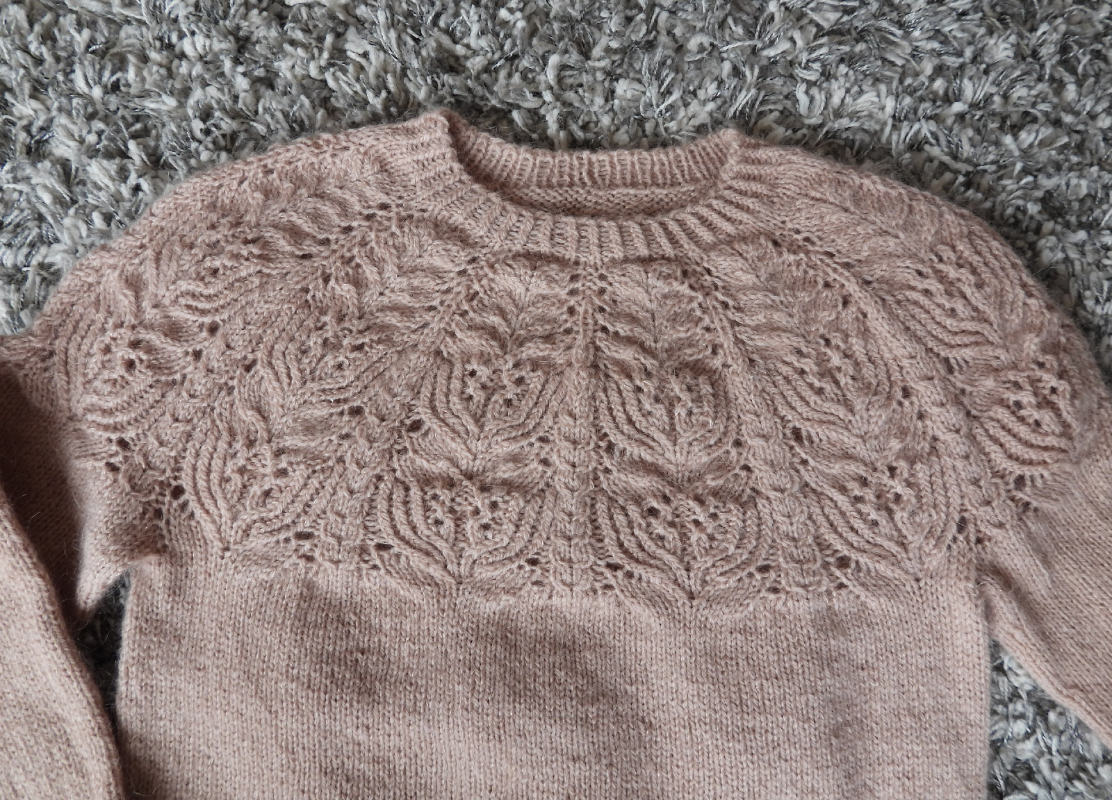 Lumoavan kaunis kaarroke tässä mallissa. Neulottu pääntieltä helmaan ja aika hidasta oli kaarrokkeen neulominen, silmukka ja rivi kerrallaan. Sitkeys palkittiin, tykkään lopputuloksesta ihan hirmuisesti. Taas uusi lempineule on valmistunut!